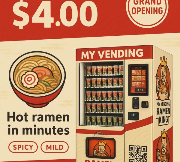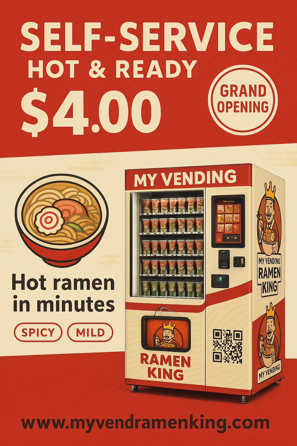 My Vending Ramen King is the first ramen vending solution designed to bring hot, fresh noodles anywhere people are hungry and on the go. Our machine delivers a real ramen bowl in minutes — no staff, no kitchen, no waiting.