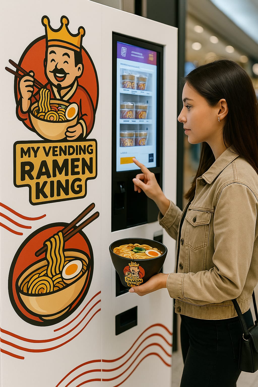No staff, no kitchen, no problem. My Vending Ramen King uses smart technology to cook noodles, mix broth and serve a hot bowl on demand.